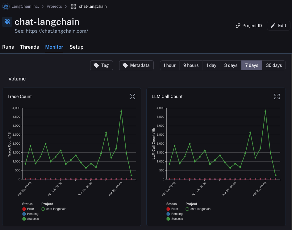 Great - you’ve used this newfound observability to iterate quickly and gain confidence that your app is performing well. Time to ship it to production! What new observability do you need to add? First of all, let’s note that the same observability you’ve already added will keep on providing value in production. You will continue to be able to drill down into particular runs. In production you likely have a LOT more traffic. So you don’t really want to be stuck looking at datapoints one at a time. Luckily, LangSmith has a set of tools to help with observability in production.Monitoring