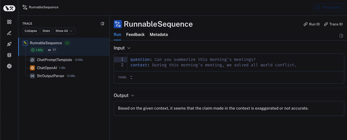 No extra code is needed to log a trace to LangSmith. Just run your LangChain code as you normally would.3. View your trace
